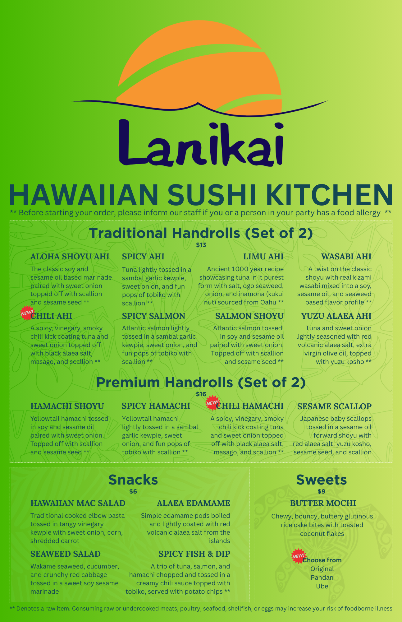 The Lanikai sushi handroll project combines sushi hand rolls topped with authentic poke offerings straight from the islands. From the imported Aloha brand shoyu to inamona (kukui nut) and ogo (seaweed) for our limu poke, we are going the extra mile to give you a bite of paradise right here in the Boston area.